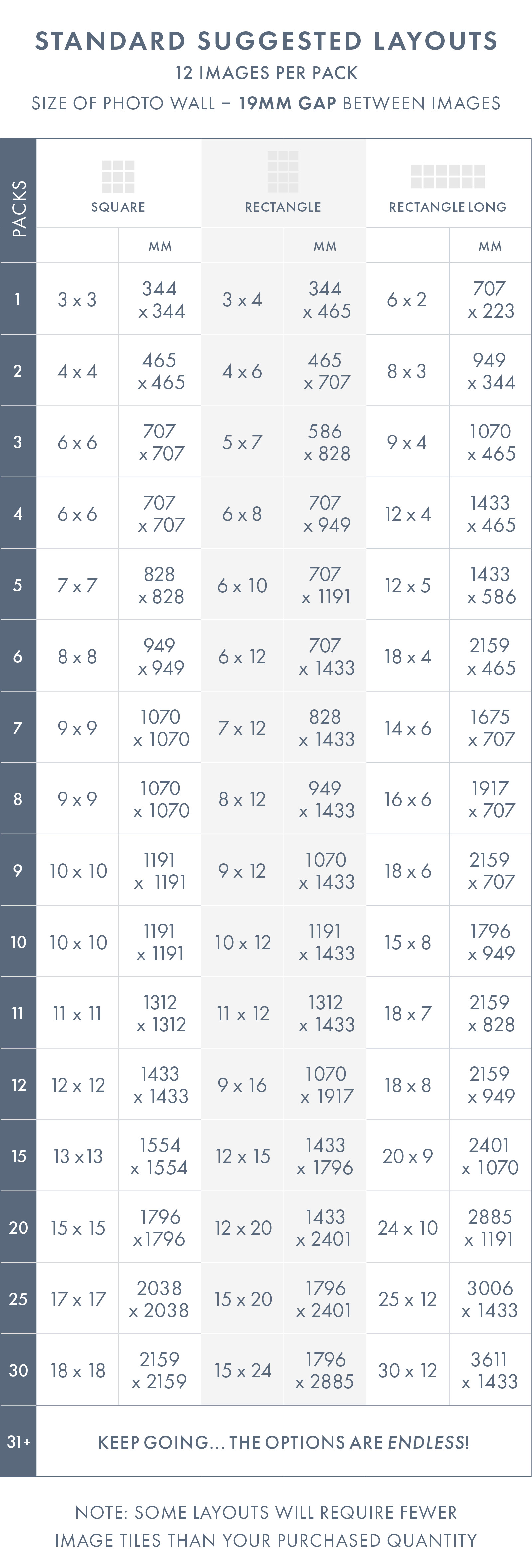 Please Note: The Photo Wall Standard Template comes FREE with orders of 36 photos or more and will be automatically supplied with your order. When purchasing 12 or 24 photos you can purchase the Photo Wall Standard Template separately HERE.